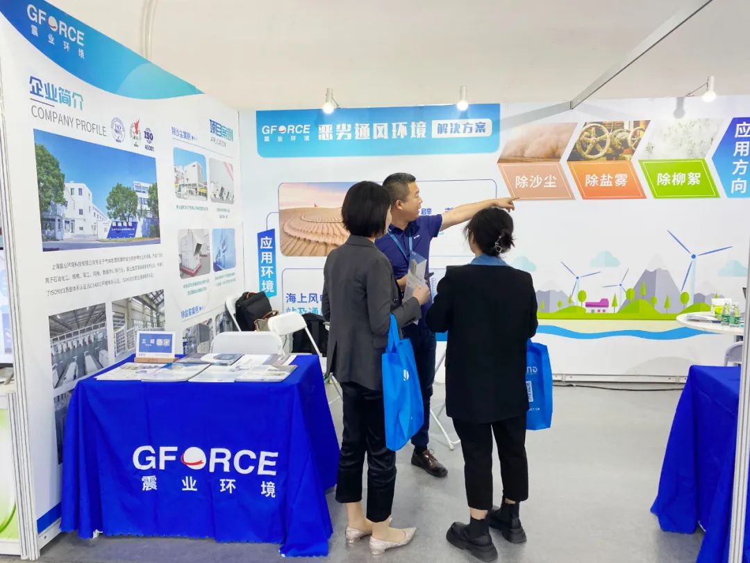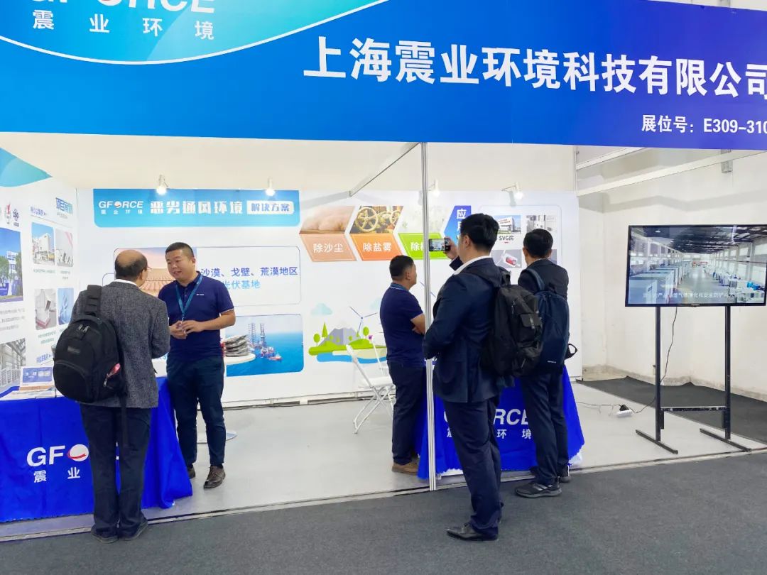 “沙戈荒”作為“十四五”時期推動新能源實現(xiàn)高質(zhì)量發(fā)展的重要抓手,陸上大基地建設如火如荼。震業(yè)環(huán)境針對沙戈荒地區(qū)的風電、光伏基地,海上風電、光伏、升壓站等通風建筑,提供除沙、除塵、除鹽霧、除柳絮等惡劣通風環(huán)境的解決方案,吸引了眾多參展者的駐足,震業(yè)的同事們始終以飽滿的熱情、專業(yè)的態(tài)度與參觀者溝通交流。